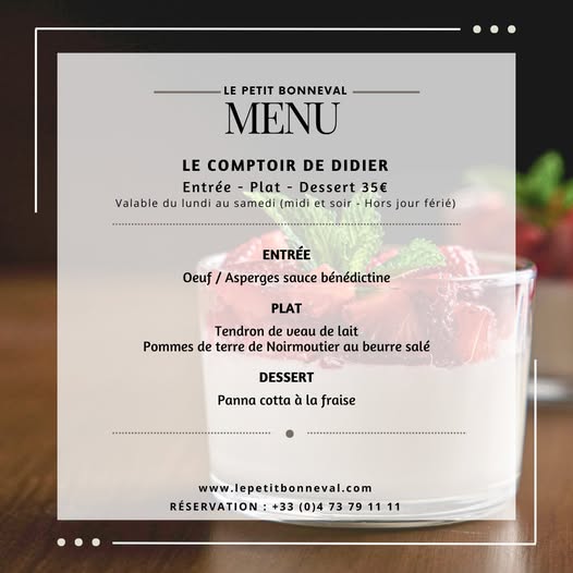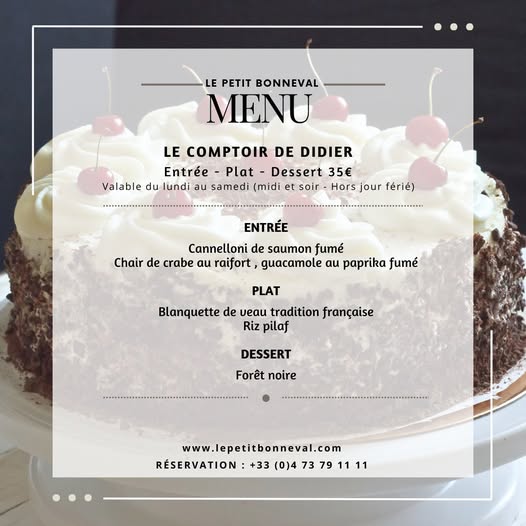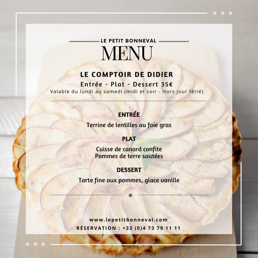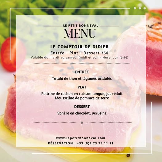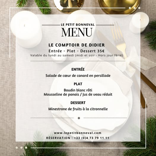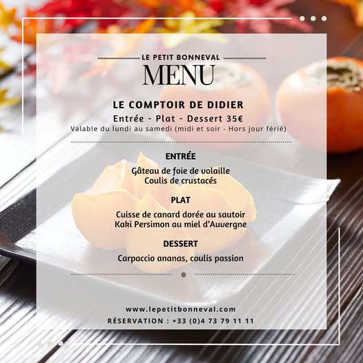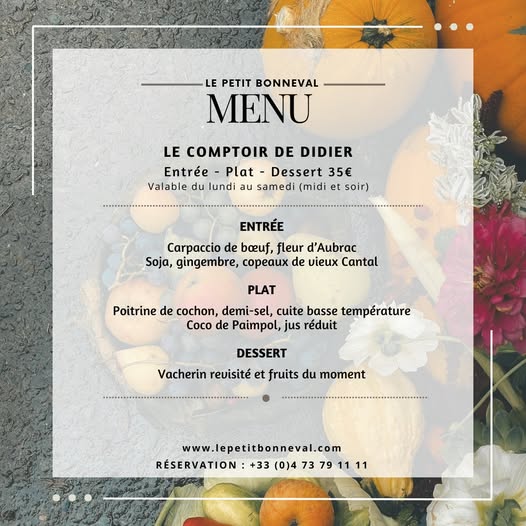 Publié sur Gaetan AuboironTrustindex vérifie que la source originale de l'avis est Google. Nous étions côté restaurant, un délice ! Des amuses-bouches au dessert, tout était succulent ! Merci pour cette belle découverte !Publié sur Marie ROUXTrustindex vérifie que la source originale de l'avis est Google. Belle découverte, cadre trés agréable, personnel trés professionnel et à l'écoute. Menu choisi excellent , une présentation un feu d'artifice pour les yeux ,un régal pour les papilles. Nous recommandons sans hésitation.Publié sur Edouard MASTrustindex vérifie que la source originale de l'avis est Google. Excellente soirée passée dans ce bel établissement à deux pas du Zénith d’Auvergne lors du Tour Auto. Belle table. Mets de qualité, goût au rdv, mention spéciale pour le ris de veau ! Les desserts sont tout autant réussis. A recommanderPublié sur Louis BTrustindex vérifie que la source originale de l'avis est Google. Un véritable coup de cœur ! Nous nous sommes régalés du début à la fin : des plats délicieux, exquis et d’une grande finesse. Mention spéciale pour les ris de veau accompagnés de spaghetti carbonara, et la souris d’agneau, fondante à souhait. L’accueil a été très agréable malgré notre arrivée un peu tardive — un grand merci pour cette attention. Une adresse à deux pas du Zénith d’Auvergne, nous reviendrons avec plaisir !Publié sur Orel B.Trustindex vérifie que la source originale de l'avis est Google. Très belle découverte grâce à un bon cadeau. Nous nous sommes régalés de la mise en bouche au dessert avec des assiettes aussi belles que bonnes. Félicitations au chef ! Le service était tout aussi impeccable et chaleureux. Nous reviendrons avec grand plaisir.Publié sur Julien TournebiseTrustindex vérifie que la source originale de l'avis est Google. Merci à cette belle maison qu'est Le Petit Bonneval pour ce beau moment passé. Les saveurs étaient douces et équilibrées, la présentation et l'accueil tout autant. Nous avons eu de belles et simples émotions qui nous tardent déjà de retrouver.